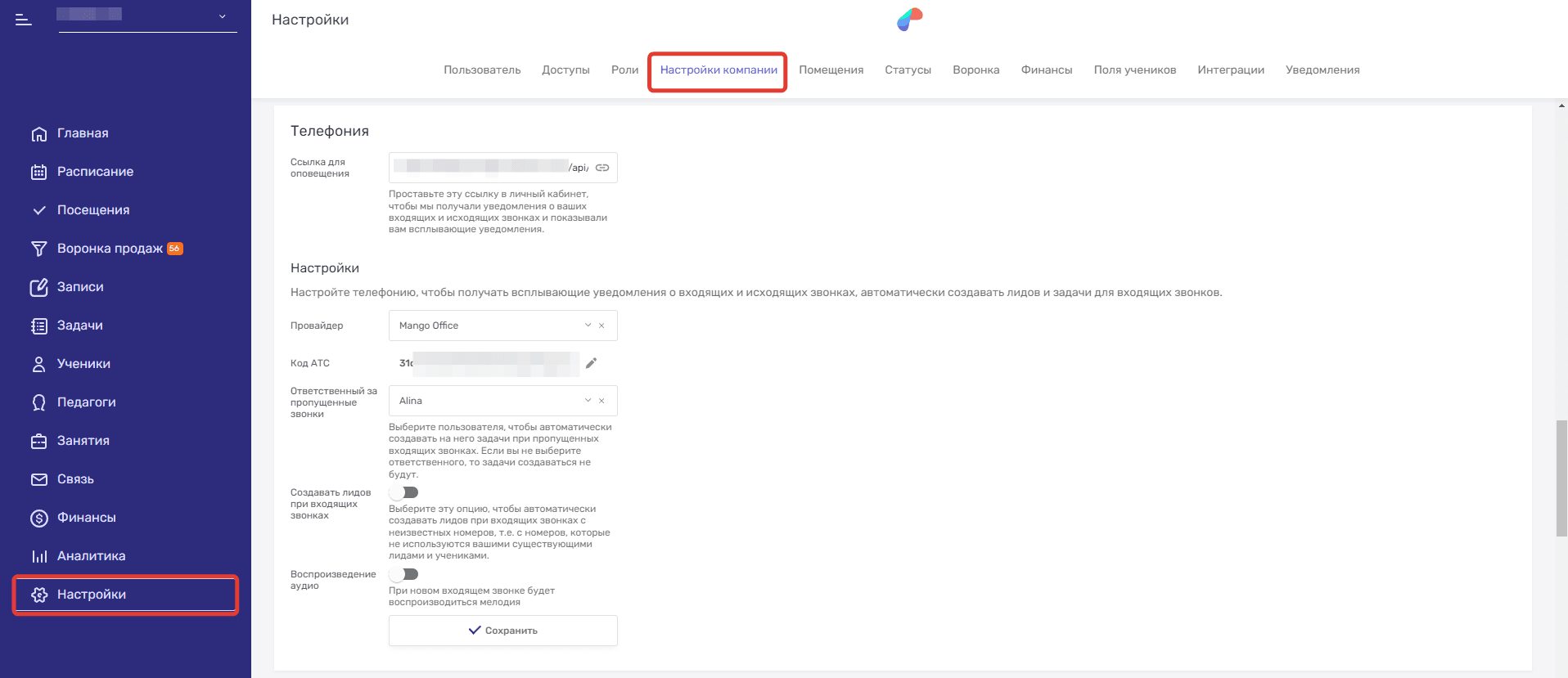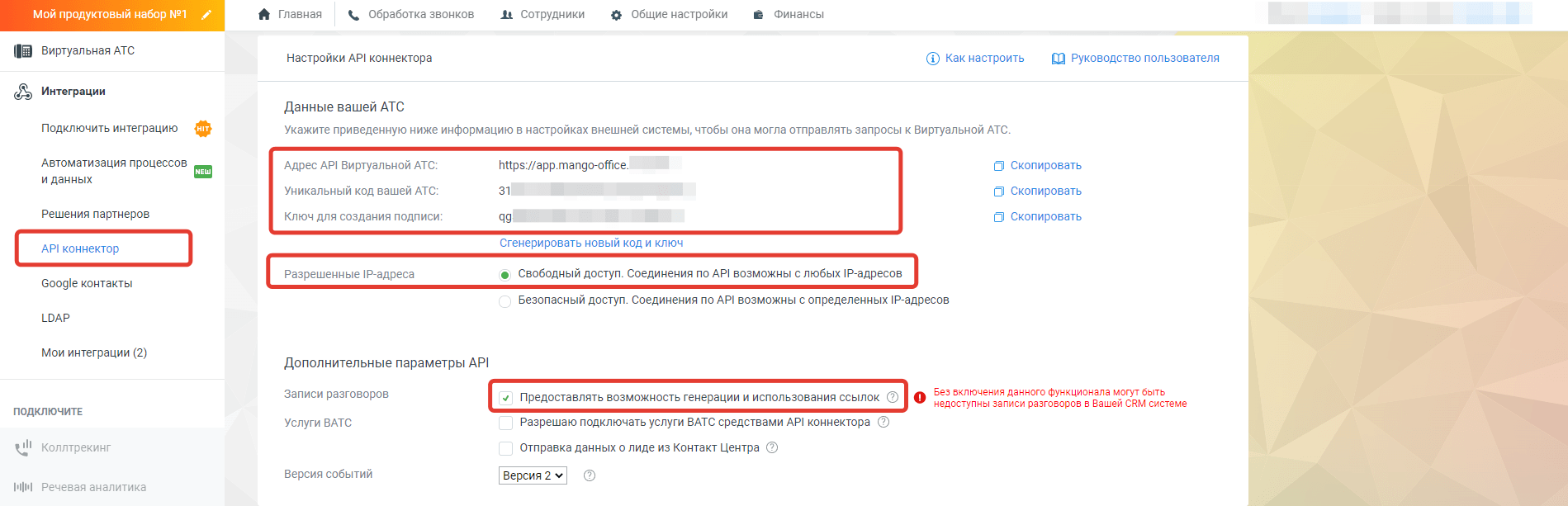 - Внесите Код АТС (код указан во вкладке API коннектор в кабинете Mango Office)