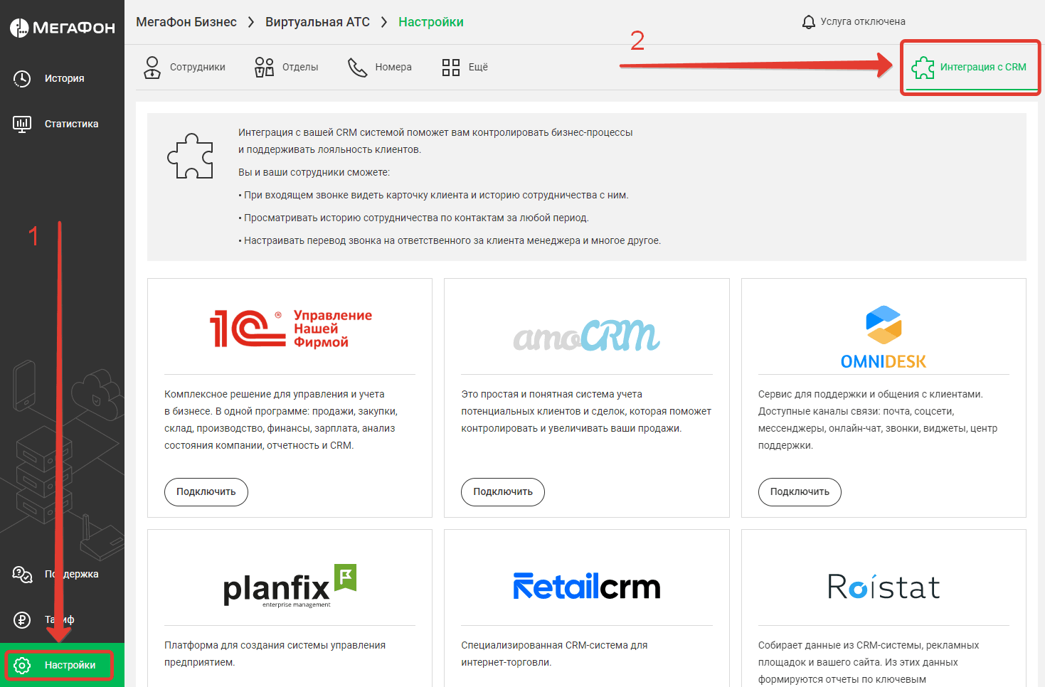 - Перейдите в Настройки, затем нажмите на Интеграция с CRM