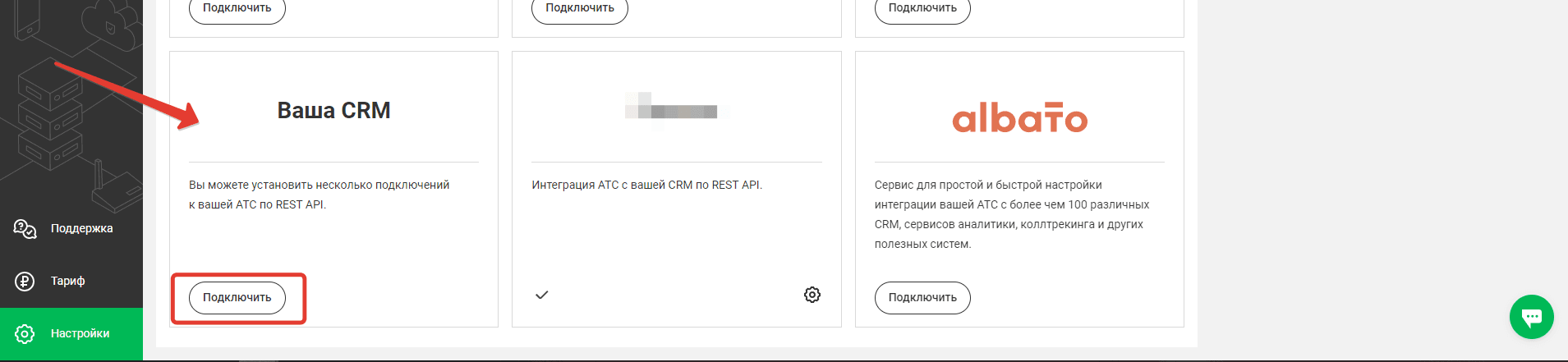 - Пролистайте в самый низ страницы и кликните на Подключить в блоке Ваша CRM
