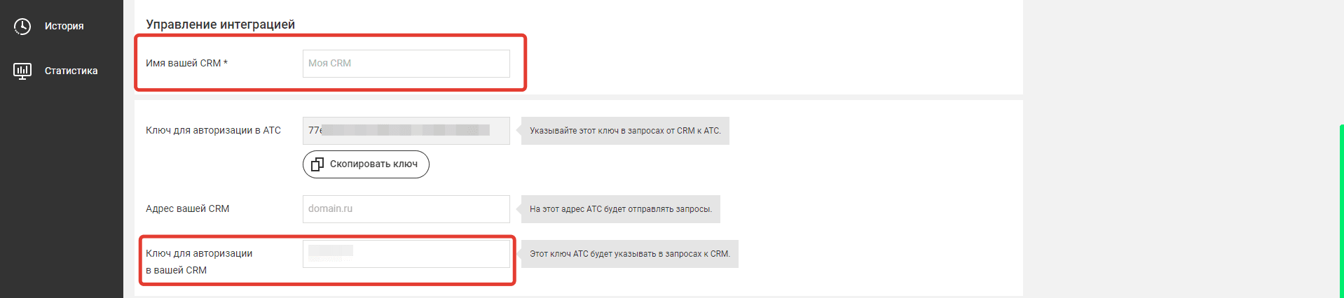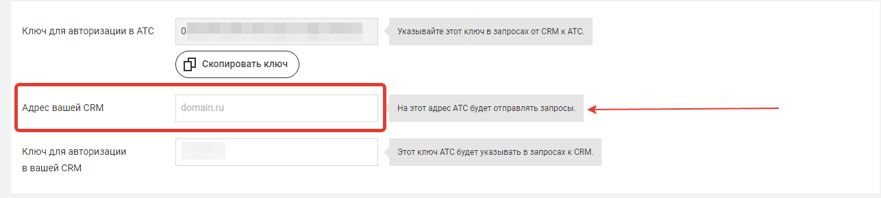 - Придумайте и укажите Ключ для авторизации в вашей CRM