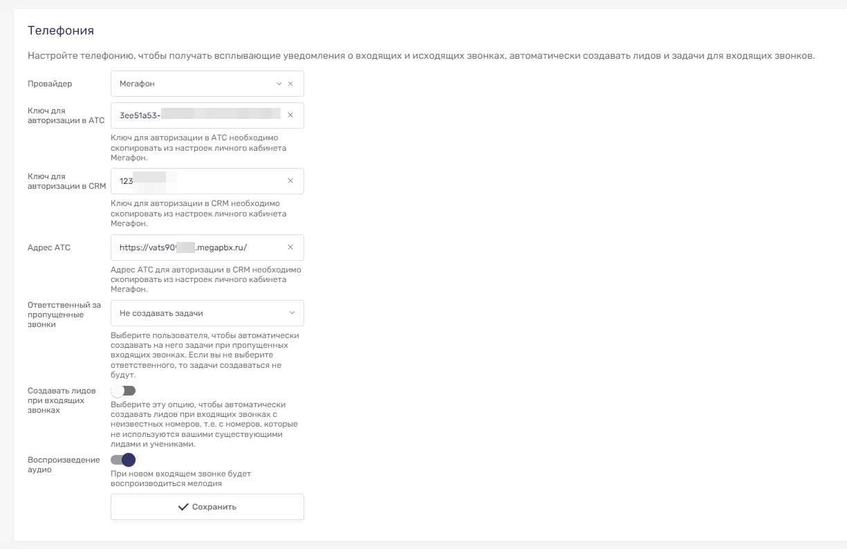 - Укажите Ключ для авторизации в CRM (тот ключ, который вы придумали и указали в Мегафон)