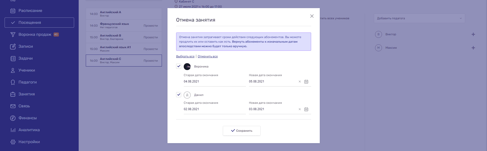 Занятие на этот день будет отменено. Если абонементы учеников отмененного занятия имеют сроки действия, то система предупредит вас о том, что отмена затрагивает сроки действия абонементов, и предложит вам их продлить.