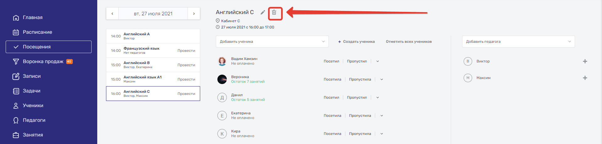 - Нажать на Удалить и подтвердить удаление отмены занятия