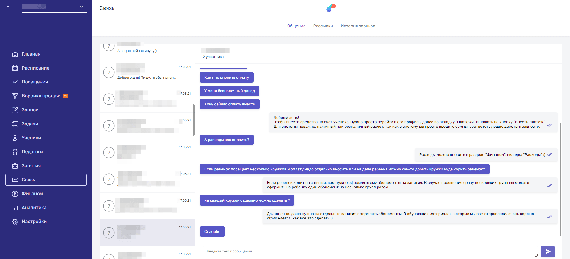 Для ведения диалогов в самой CRM-системе есть чат, который обновляется в режиме реального времени.