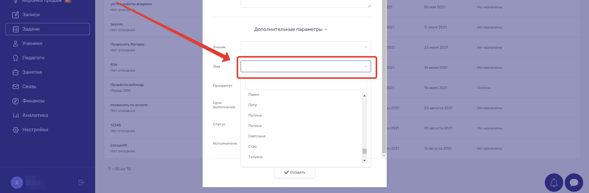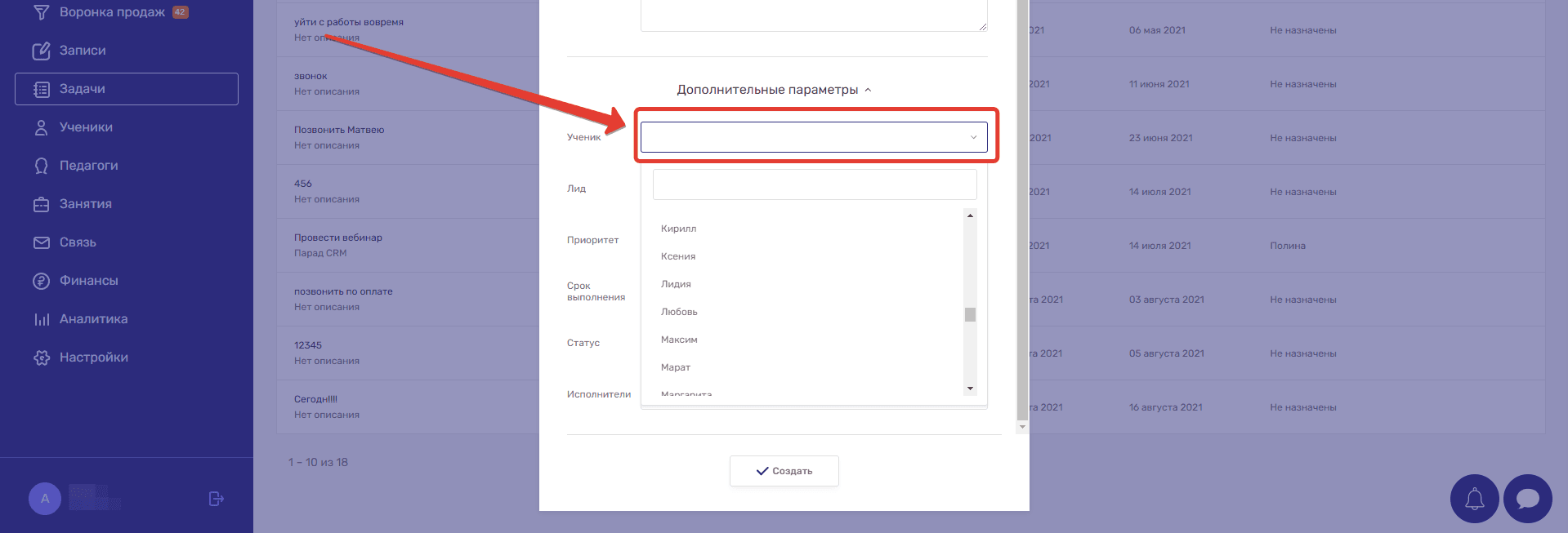 При создании задачи в Дополнительных параметрах вы можете выбрать конкретного ученика или лида. И в том, и другом случае вы сможете выбрать любого ученика или лида из списка.