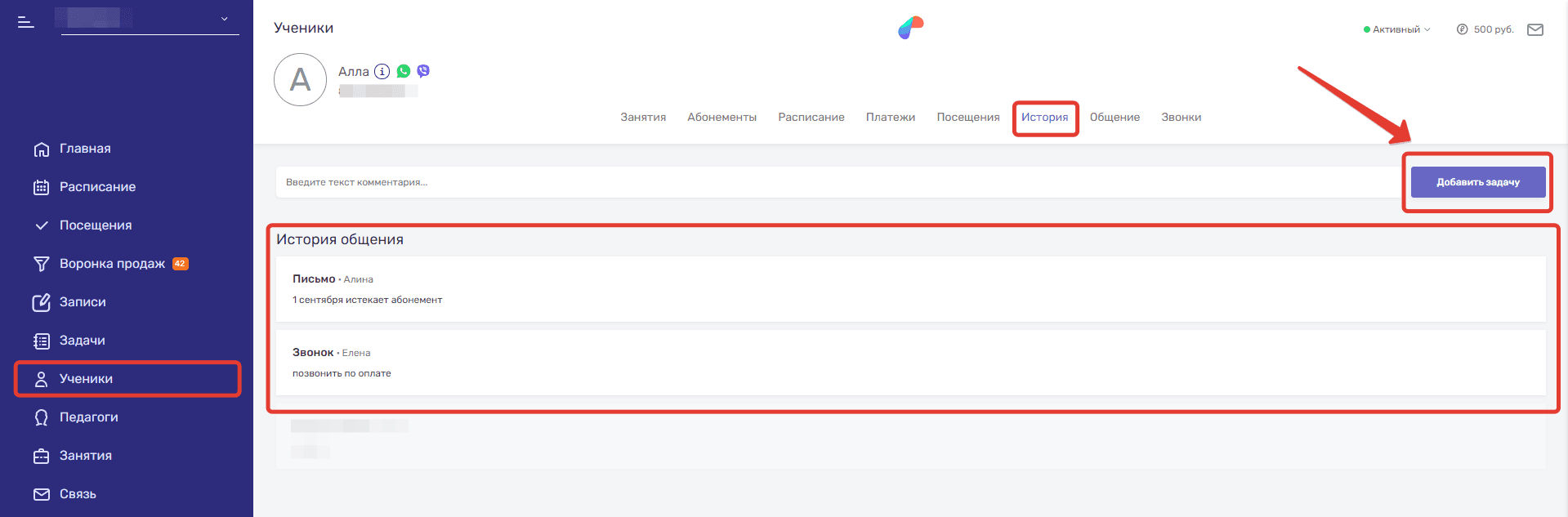 За ним закрепится задача, которая будет отображаться в Истории ученика или лида. Здесь же можно добавить еще одну задачу.