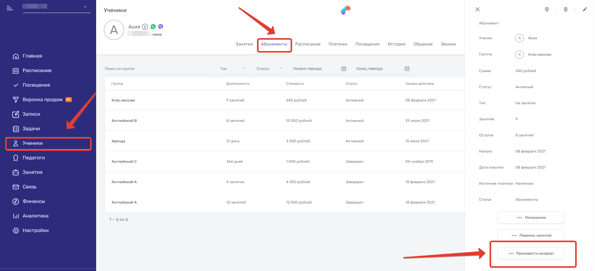 По такому же алгоритму можно сделать возврат в разделе Занятия у выбранного занятия во вкладке Абонементы.