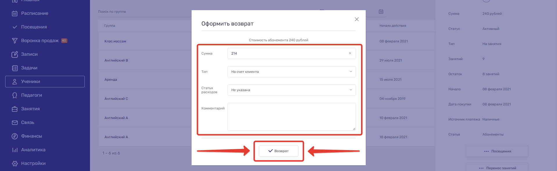 Важно знать: возвраты по абонементам с типом На занятия просчитываются автоматически, исходя из количества посещенных занятий. Например, абонемент стоил 8000 рублей на 8 занятий, ученик отходил 4 занятия, возврат будет равен 4000 рублей. Возвраты по абонементам с типом На период автоматически не считаются, сумму возврата необходимо будет внести вручную.
