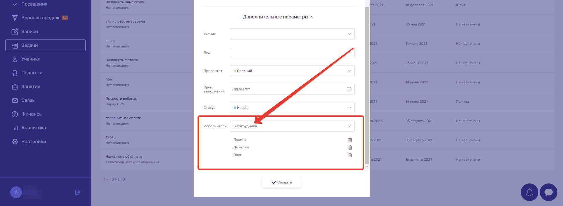 У задачи может быть несколько исполнителей. Чтобы назначить более одного ответственного сотрудника, вам просто нужно в Дополнительных параметрах при создании или редактировании задачи выбрать несколько пользователей.