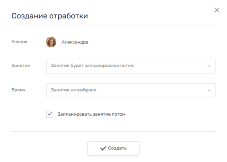 Чтобы сразу назначить время отработки, снимите эту галочку, выберите занятие и время из списка и нажмите Создать.