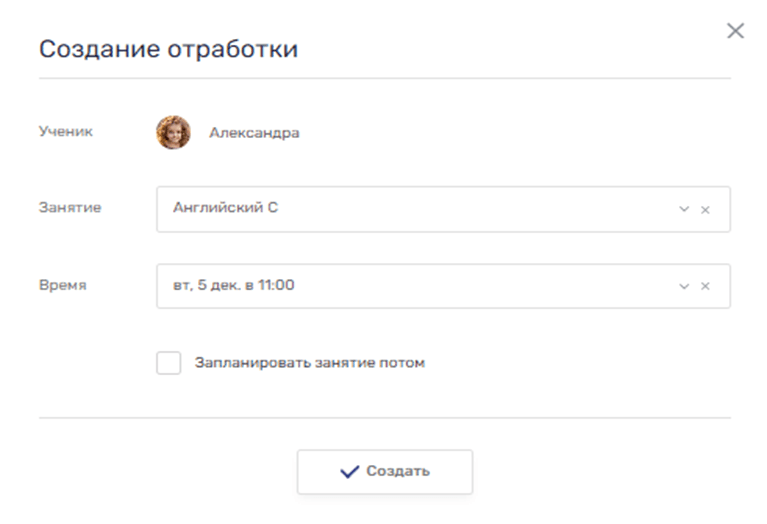 Если вам необходимо проставить отработку позже, оставьте галочку на Запланировать занятие потом и нажмите Создать.