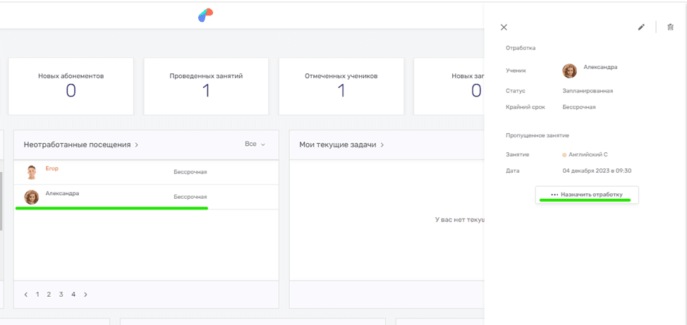 В том случае, если вы указали, что запланируете занятие потом, вы можете найти информацию о нём на Главной странице в блоке Неотработанные посещения. Для назначения даты и времени отработки нажмите на это посещение и в появившейся справа панели с информацией кликните на кнопку Назначить отработку.