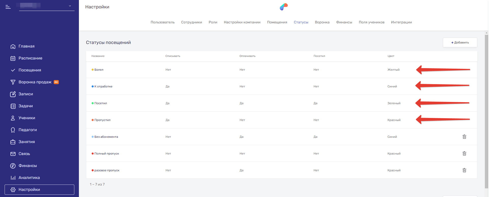 Статусы посещений позволяют разделять учеников. Например, вы можете создать статусы: пробное занятие, открытый урок и т.д.
