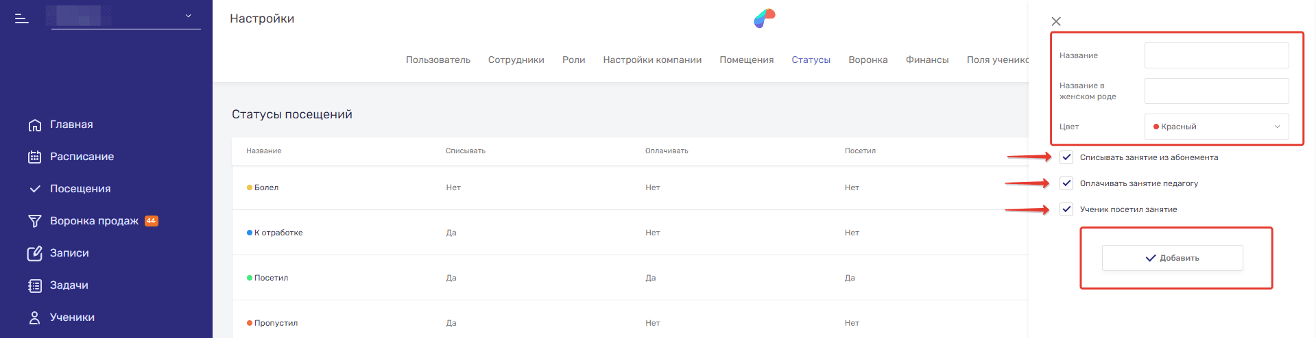 - Нажать кнопку + Добавить в блоке Статусы посещений