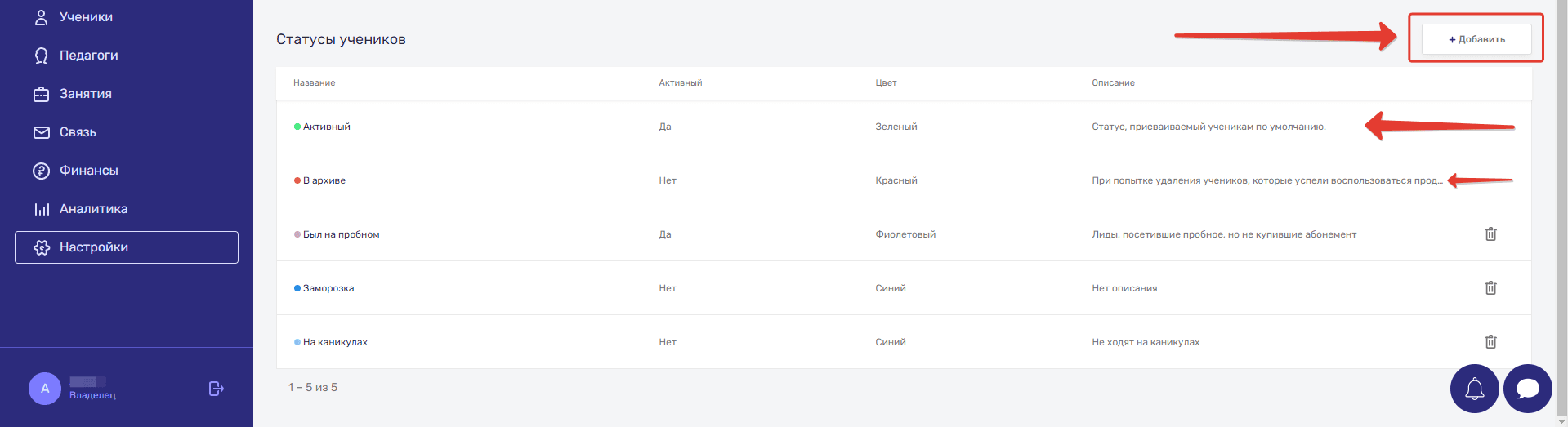- Нажмите кнопку + Добавить в блоке Статусы учеников