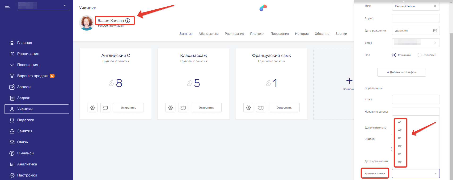Поля учеников необходимы для указания важной дополнительной информации о ваших клиентах. Вы можете использовать поля для указания уровня языка, хранения ссылки на договор на облачном диске или для любых других данных.