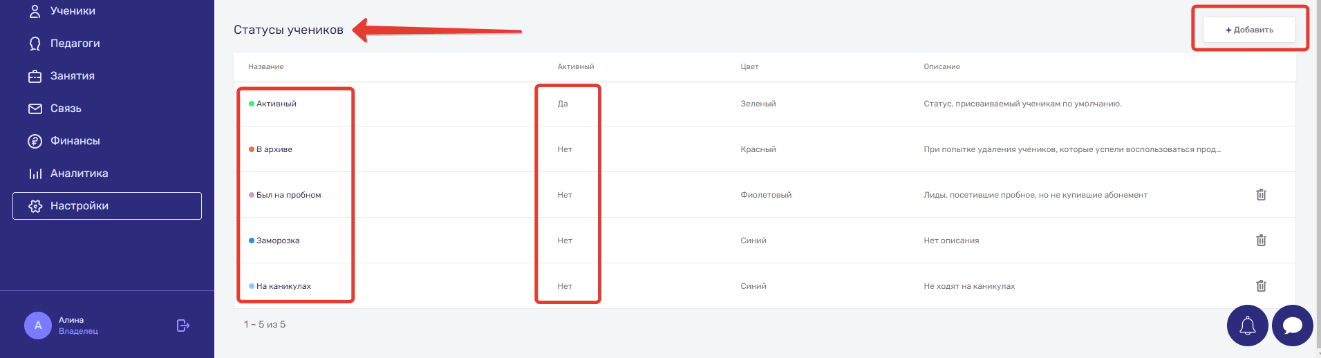 О том, как создать статус учеников или отредактировать его, подробно описано в главе Настройки, статья Статусы.