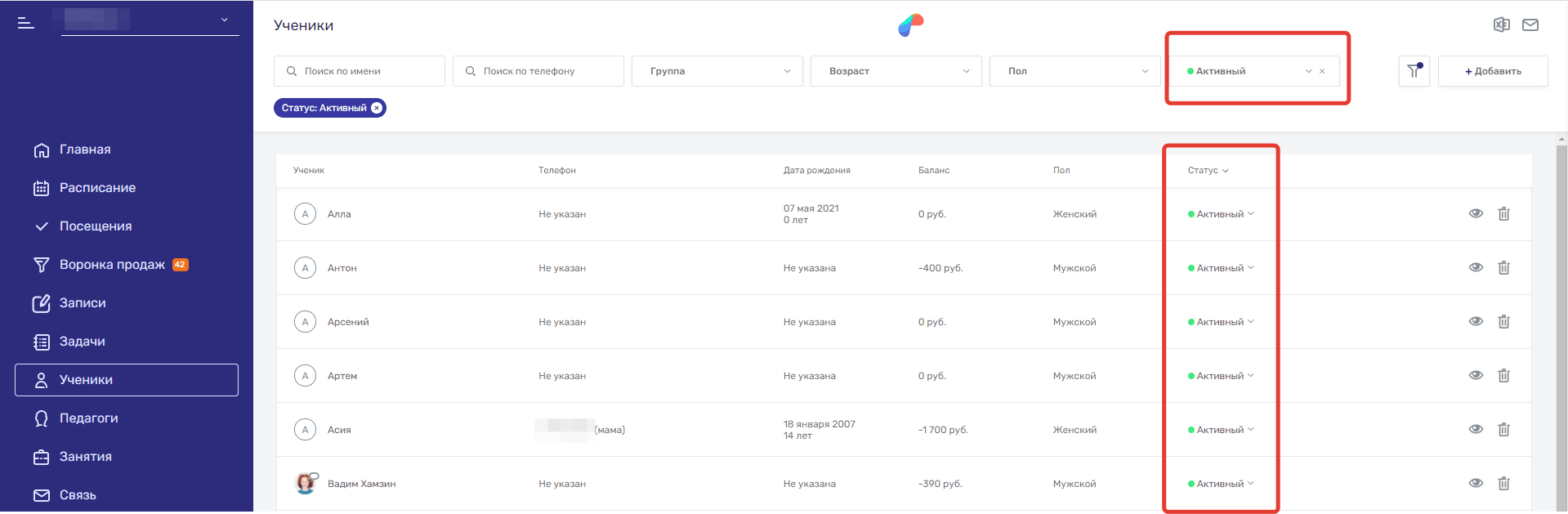 В разделе Ученики у каждого ученика есть свой статус, который можно в любой момент изменить. По этому же статусу вы можете фильтровать список своих учеников.