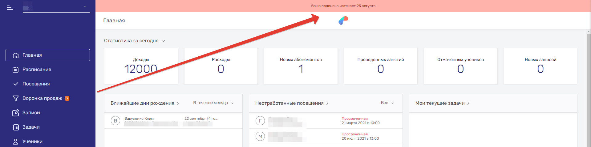 За несколько дней до окончания подписки у вас в системе появится красная плашка в самом верху. Сначала она будет показывать количество дней до момента отключения системы, затем — дату окончания подписки.