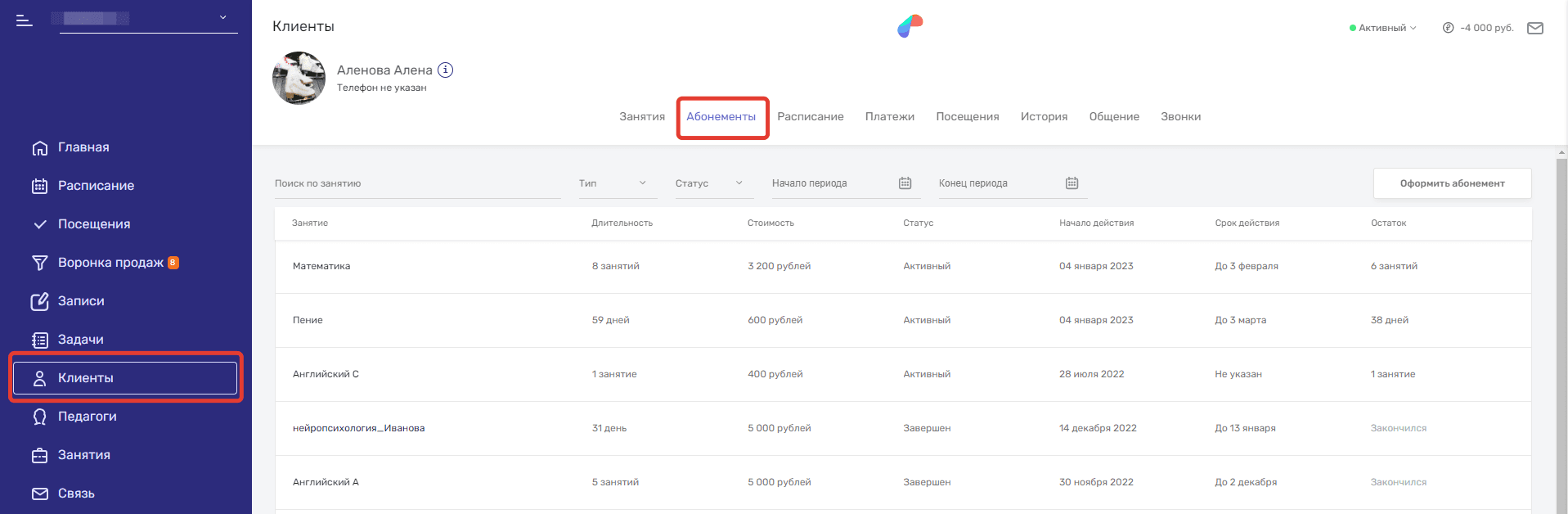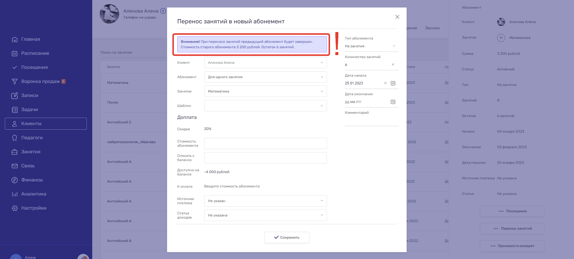 Дополнительная информация: система сообщит вам об остатке на абонементе и его стоимости. Указывать итоговую стоимость нового абонемента нужно с учетом старого абонемента. Количество занятий/услуг или дней указывается полностью с учетом оставшихся занятий/услуг или дней. Пример: на абонементе есть остаток - 1 занятие/услуга. Переносится это занятие/услуга на новый абонемент на 4 занятия. В поле Количество занятий/услуг нужно указать именно 4 занятия/услуги.