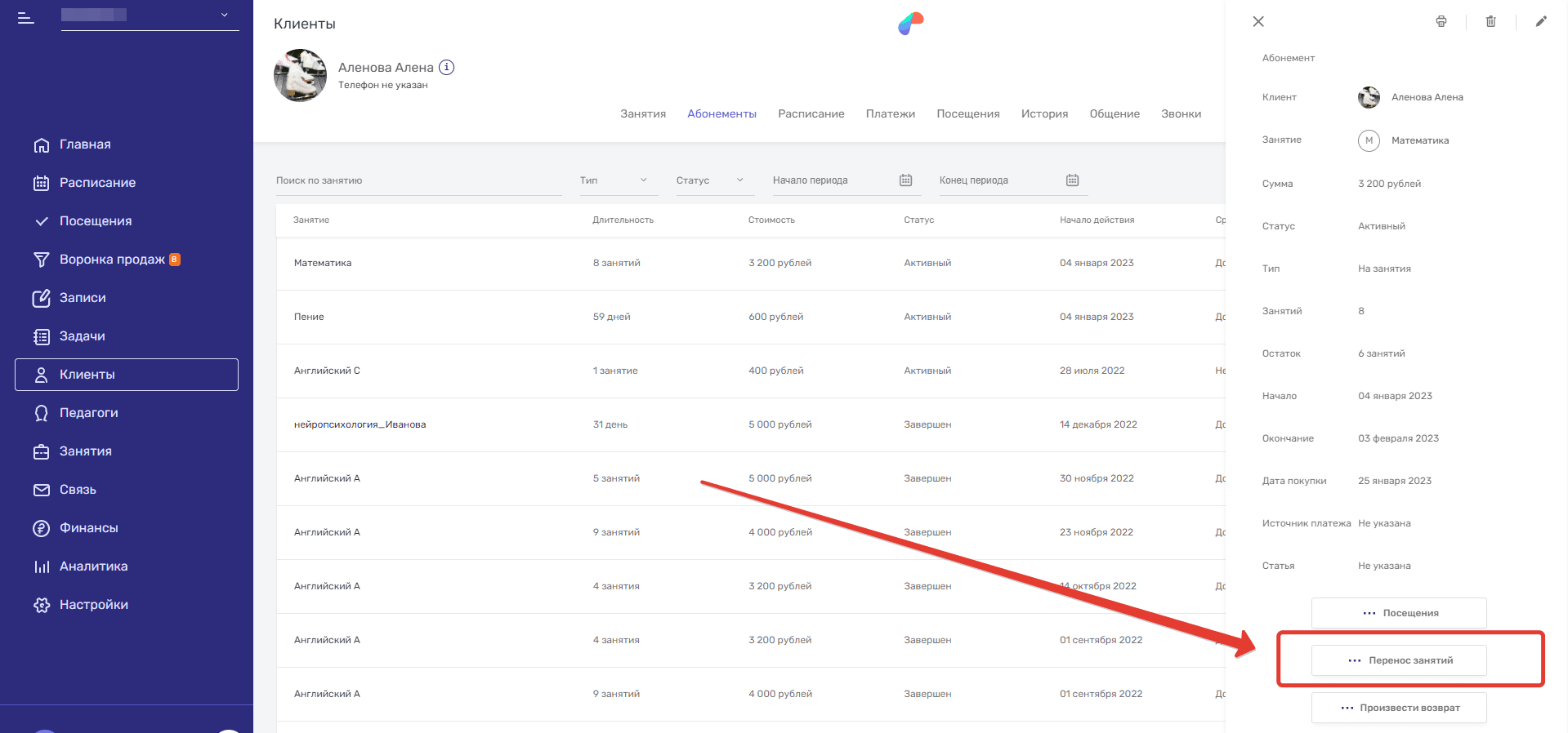 В системе доступна функция переноса занятий/услуг с одного абонемента на другой. При этом абонемент, с которого осуществляется перенос, будет автоматически завершен.