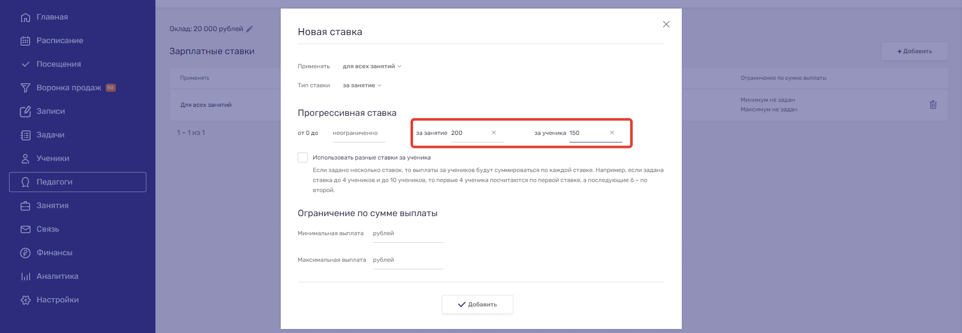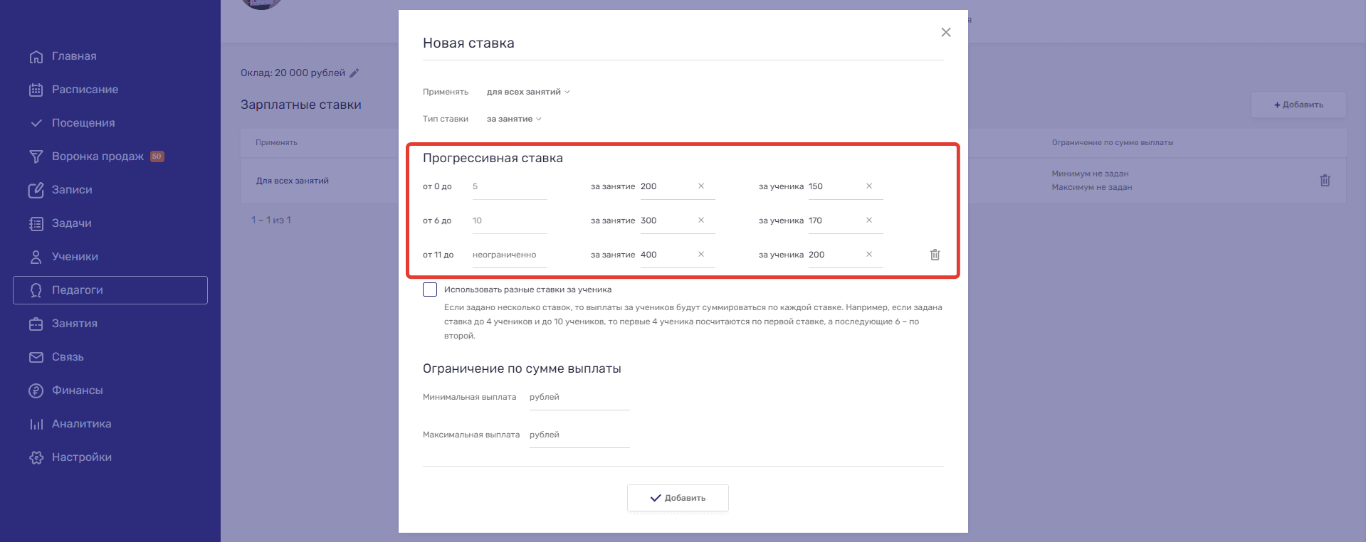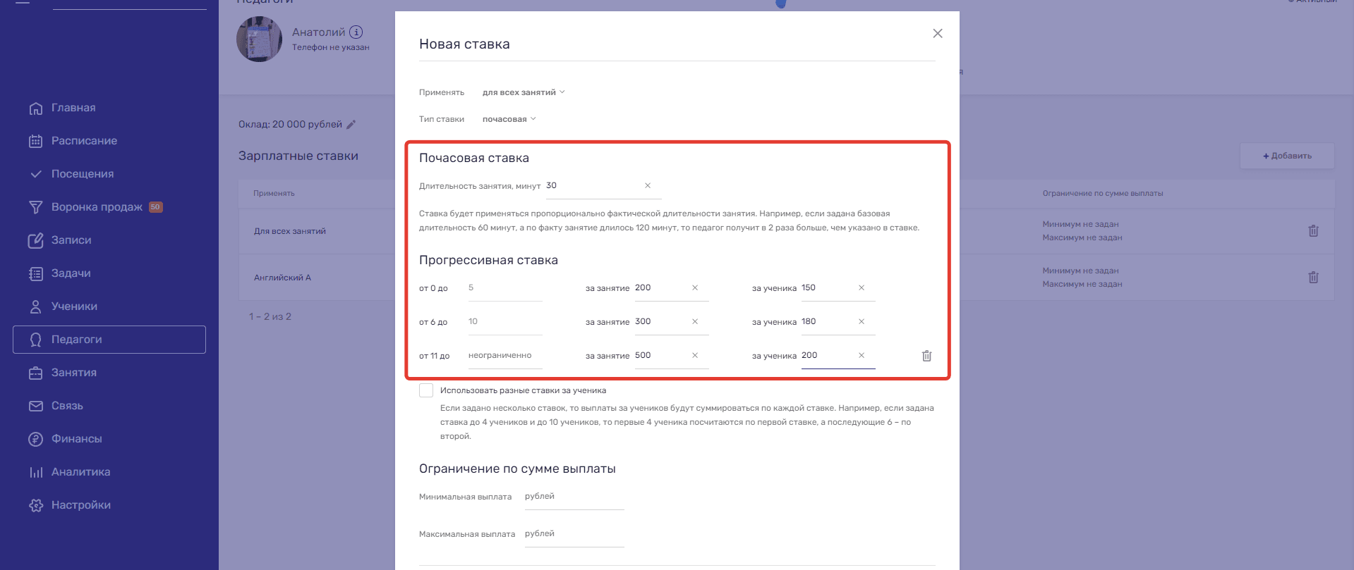 Если вы поставите галочку у пункта Использовать разные ставки за ученика, то выплаты за учеников будет по разной ставке. Возьмем пример выше. Первые 5 учеников будут считаться по 200 рублей за занятие и 150 рублей за ученика. Ученики с 6-го по 10-го будут считаться по 300 рублей за занятие и 180 за ученика. При условии, что занятие длилось 30 минут, иначе система будет применять Прогрессивную ставку пропорционально фактической длительности занятия.