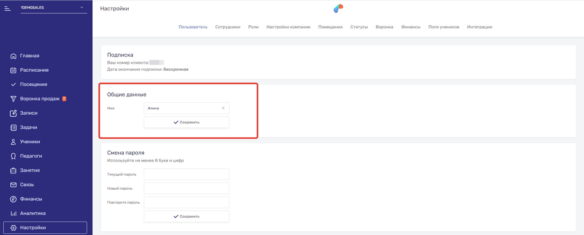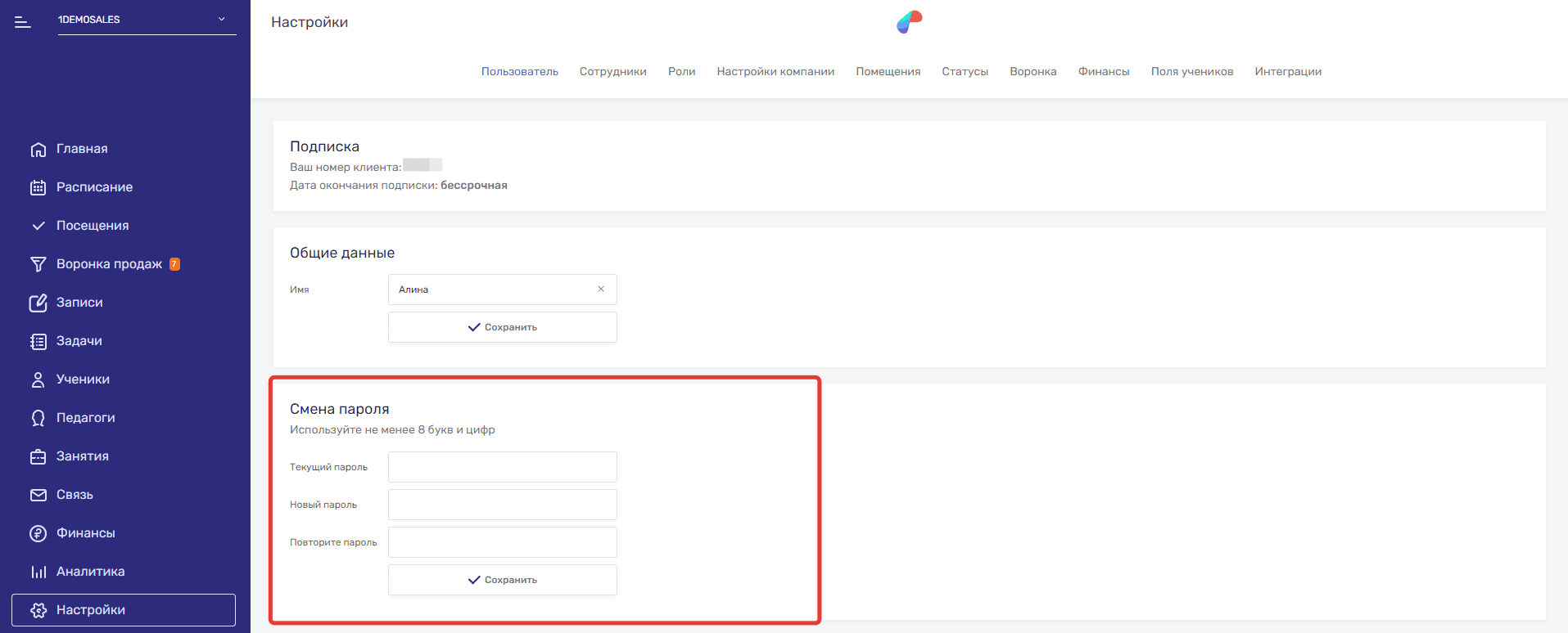 Сменить пароль можно в разделе Настройки, при переходе в него сразу открывается нужная вкладка Пользователь. Для смены пароля нужно: