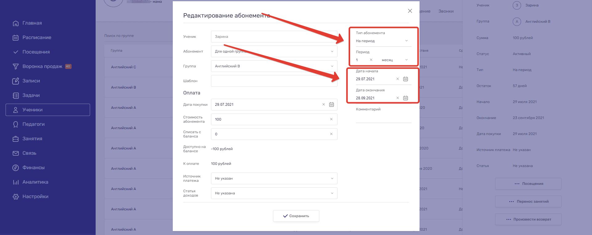 Важно знать: у абонементов типа На период есть период действия и дата начала/окончания абонемента. Например, если вы укажете абонементу тип На период и период действия — 1 месяц, а в дате начала/окончания абонемента укажете 2 месяца, то система будет считать именно по дате начала/окончания абонемента.