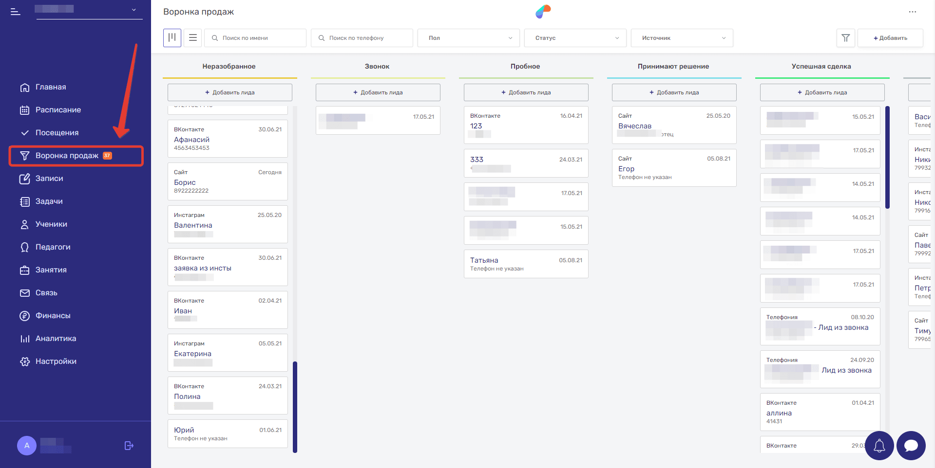 Воронка продаж необходима для полноценного сопровождения клиента с момента первого обращения к вам до покупки. Ваш клиент в виде лида перемещается по этапам, в итоге идеальный результат работы с клиентом — переход лида на этап Успешная сделка, то есть покупка ваших услуг, и конвертация лида в ученика. В Параплан CRM воронка состоит из этапов, которые вы можете редактировать, а также добавлять новые.