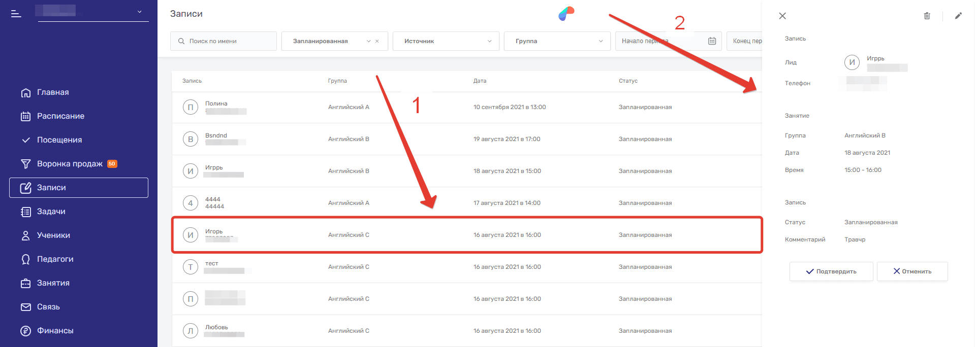 Запись — это единичное добавление на конкретное занятие ученика или лида. Такой формат идеально подходит для записи клиентов на пробные занятия, открытые уроки.